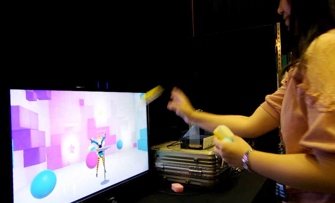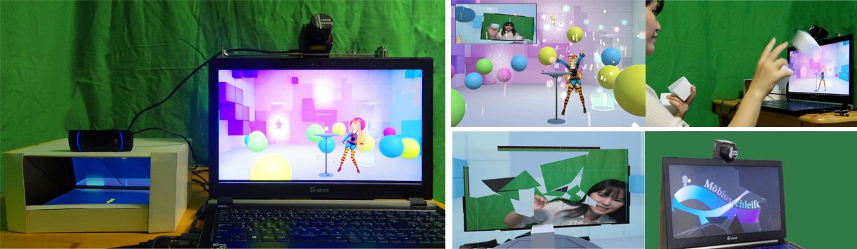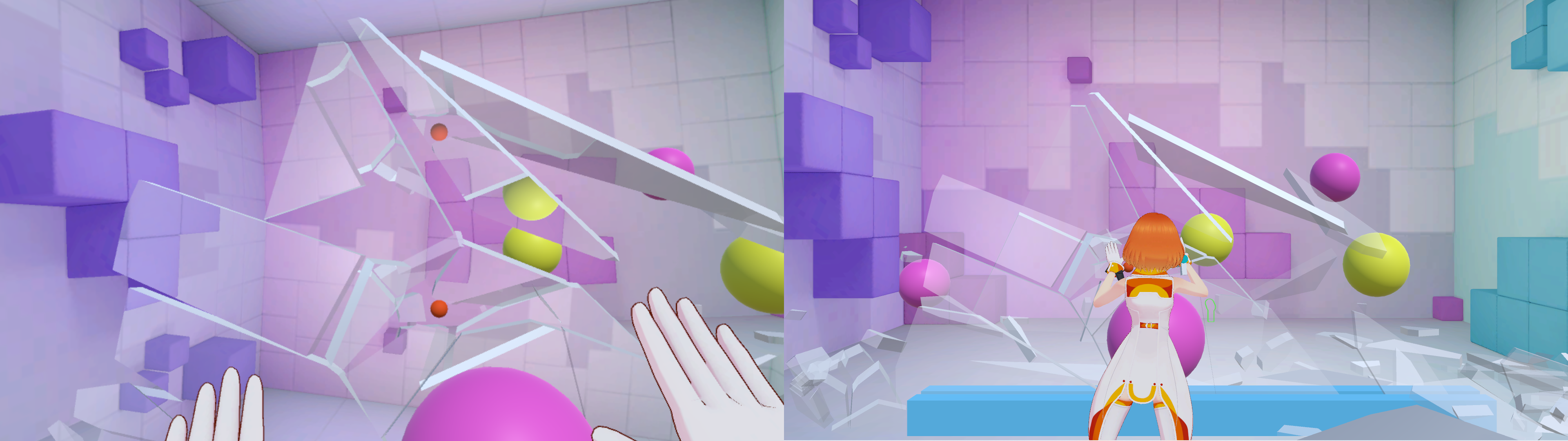 Virtual reality (VR) has become popular to be utilized in the many fields especially in the result of breakthrough of head-mounted display (HMD). HMDs provide immersive VR experiences by showing another image to alter the scenery, but external audiences are excluded from a VR experience. On the other hand, researches and applications focusing on the interaction between the VR and real have been increasing. Our previous research “Möbiusschleife” dealt with the above theme and demonstrated in VRCAI’19 [1]. We found some problems in our proposing methods, so that we improve them by the following ways: displaying hologram, synchronizing VR player’s posture, controlling physical devices with VR controller, and proposing a new way to use “Virtual Window” method. For expressing our concept, we develop a VR collaborative game. The same goals for a VR player and audiences clearly describe the contents and research concepts. Our new application with our new methods enhances the interaction and the presence of the VR avatar in the real world.